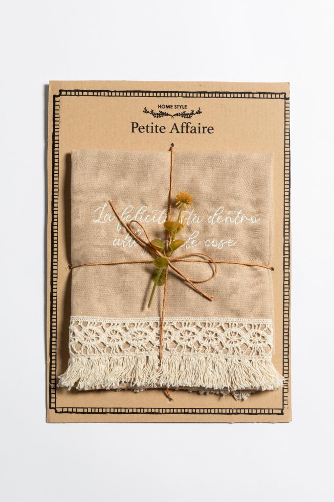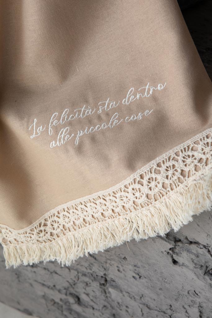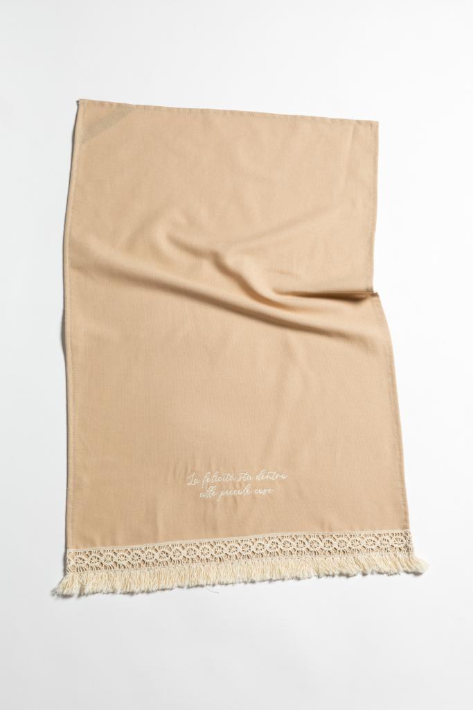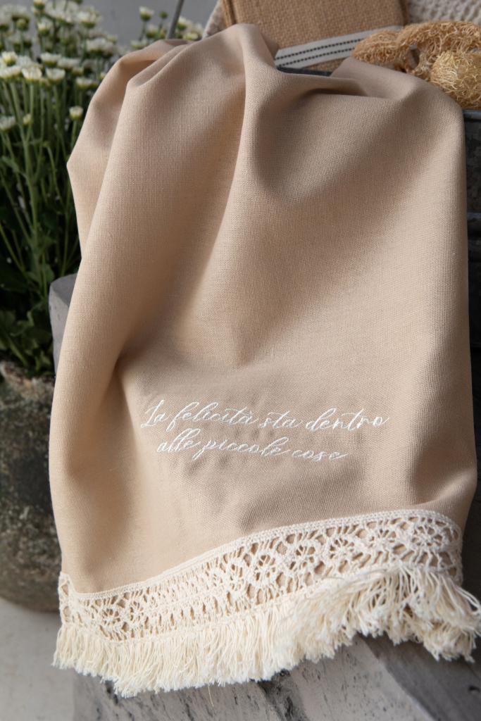 Elegancia y detalle en cada rincón. Confeccionada en lino sastrero, esta toalla combina textura natural con un delicado detalle de puntilla desflecada y bordado en tono natural que realza su estilo clásico.