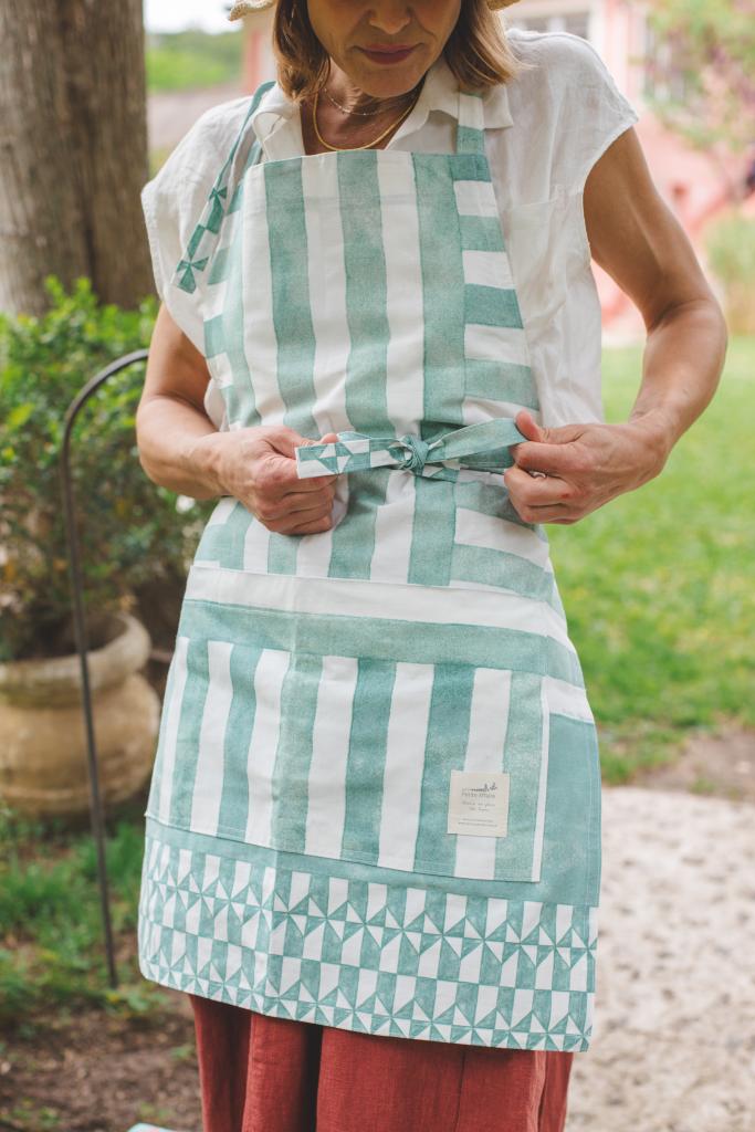 Este encantador delantal esta confeccionado en Gabardina 100% algodón. Su tacto es suave, tiene buen cuerpo y su género es resistente a los lavados. El mismo tiene detalle de pechera y un amplio bolsillo en el frente.