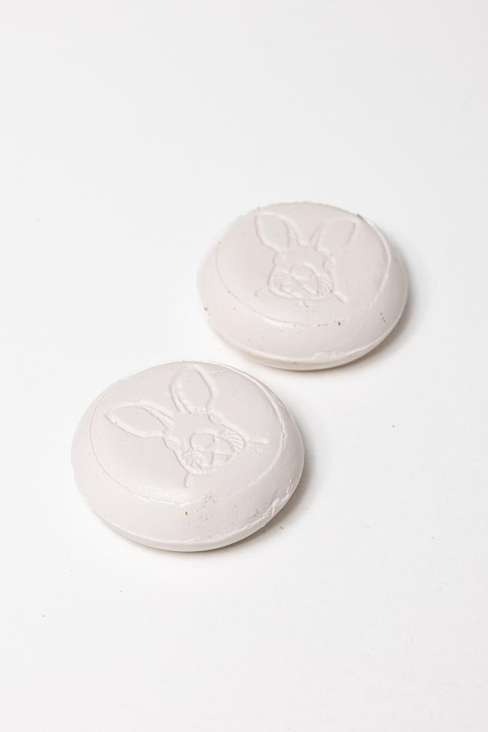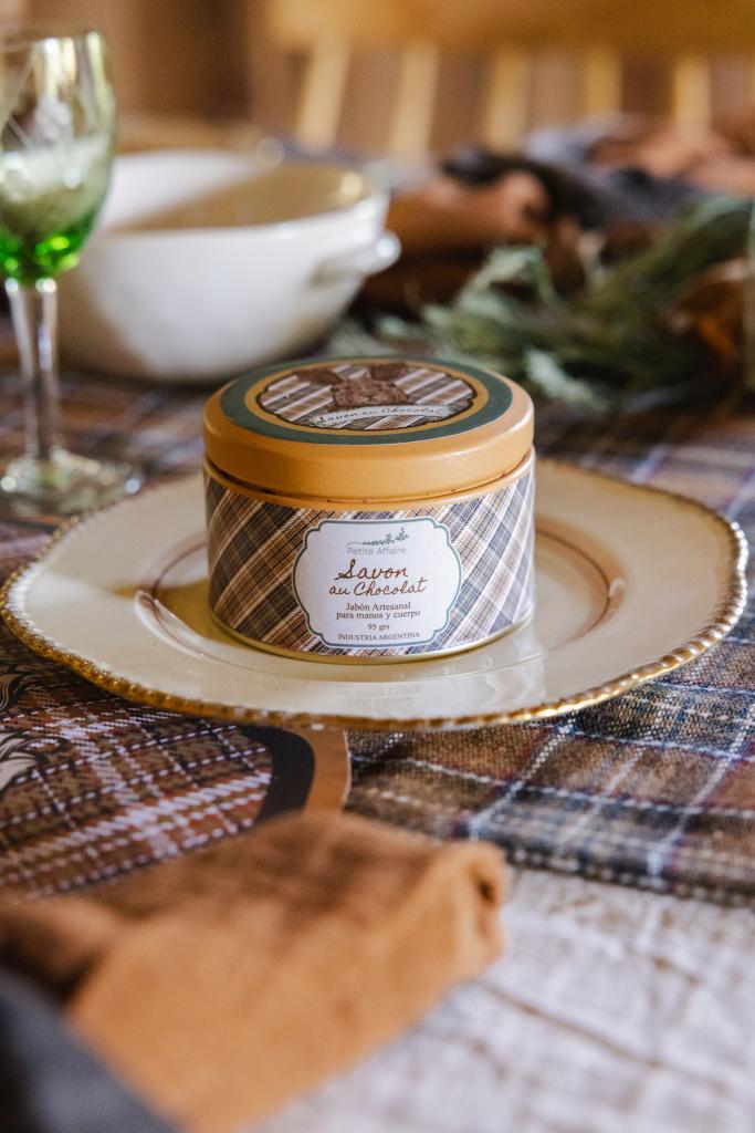 Lata decorativa con tapa, que contiene en su interior un jabón sólido artesanal perfumado con aroma a chocolate. Un objeto pensado para regalar o sumar un detalle delicado y temático a la mesa de Pascua.
