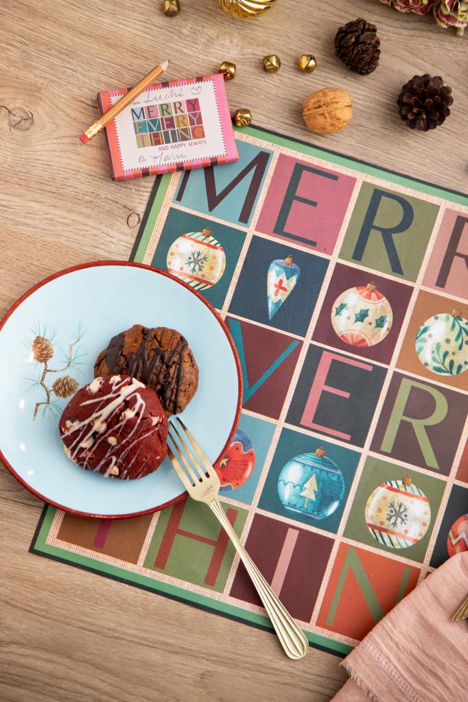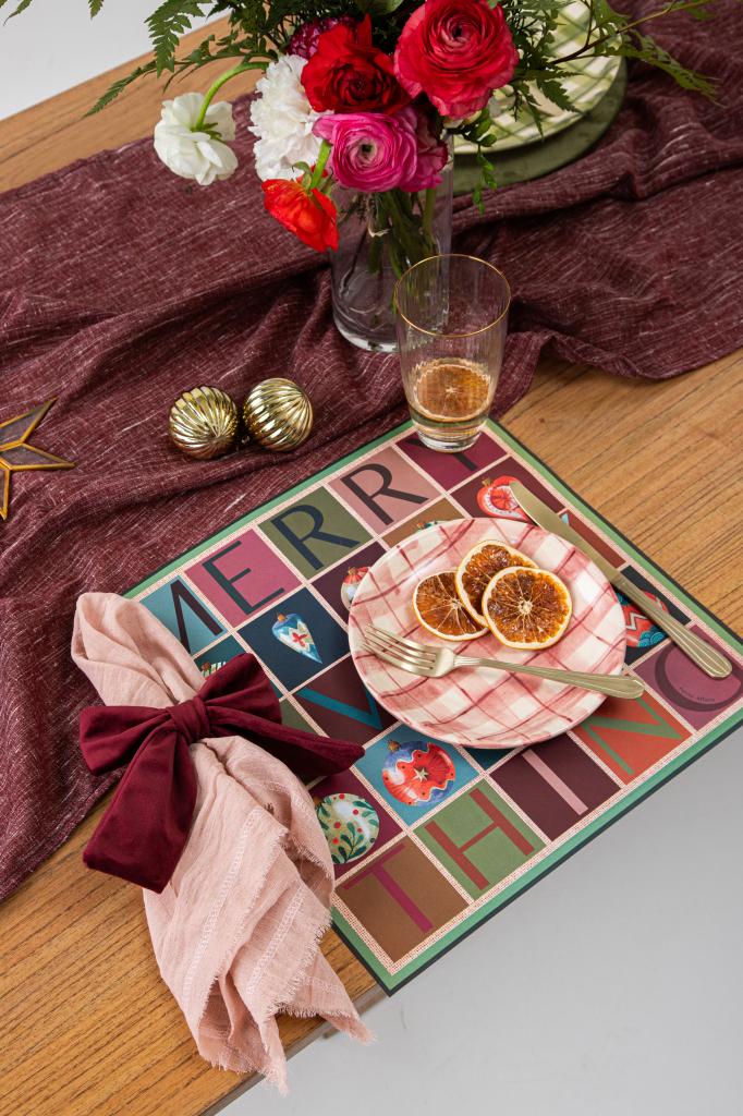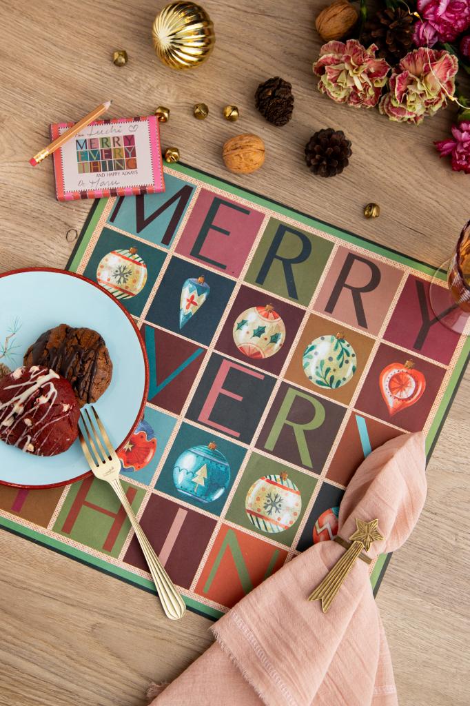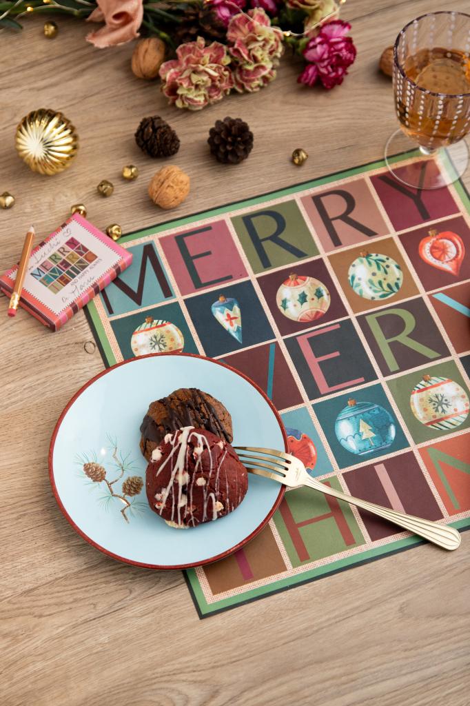 Plato de sitio con diseño navideño, ideal para combinar con nuestras servilletas Merry y camino de paño a cuadros bordó.