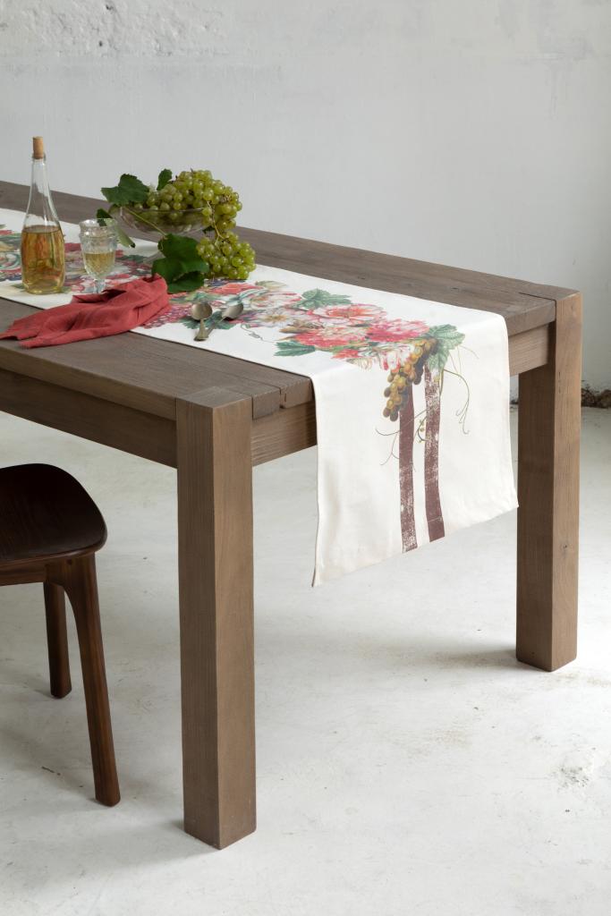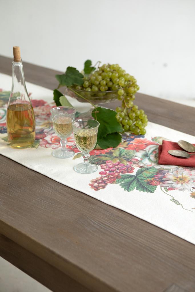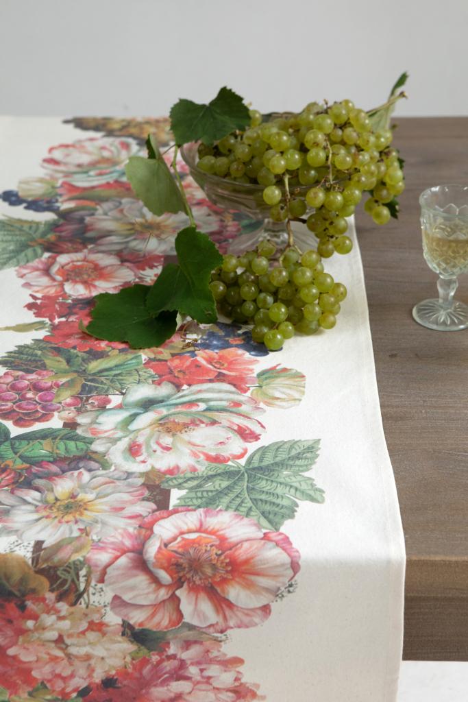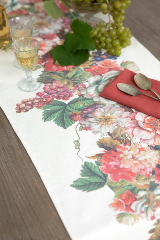 Vestí tu mesa con el encanto natural de nuestro camino de lona con estampa digital Cosecha. Flores en plena floración, racimos de uva y hojas en tonos intensos crean una composición elegante, fresca y con carácter.