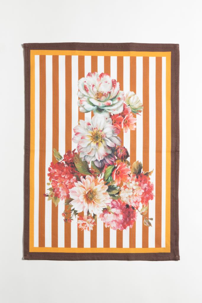 Su estampa exclusiva, con flores y racimos de uva sobre fondo rayado en tonos cálidos, aporta color y carácter, transformando un básico en un detalle decorativo.