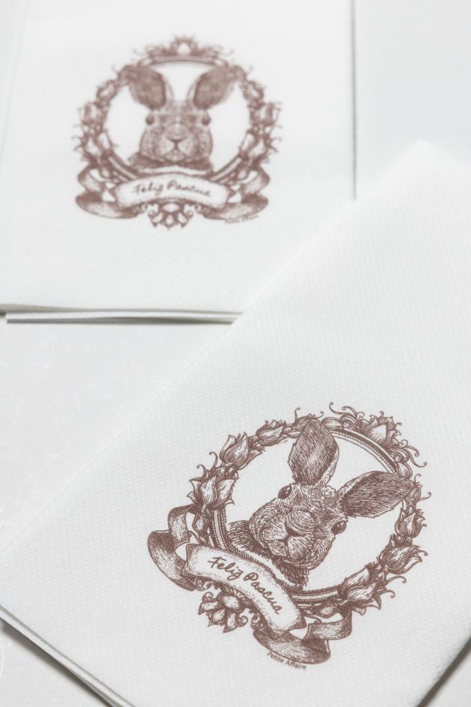 Pack de 12 servilletas Airlaid, simil tela, suaves al tacto y con excelente absorción. Diseño exclusivo de Pascua con ilustración clásica de conejo y la frase “Feliz Pascua”, ideal para sumar detalle y diseño a la mesa.
